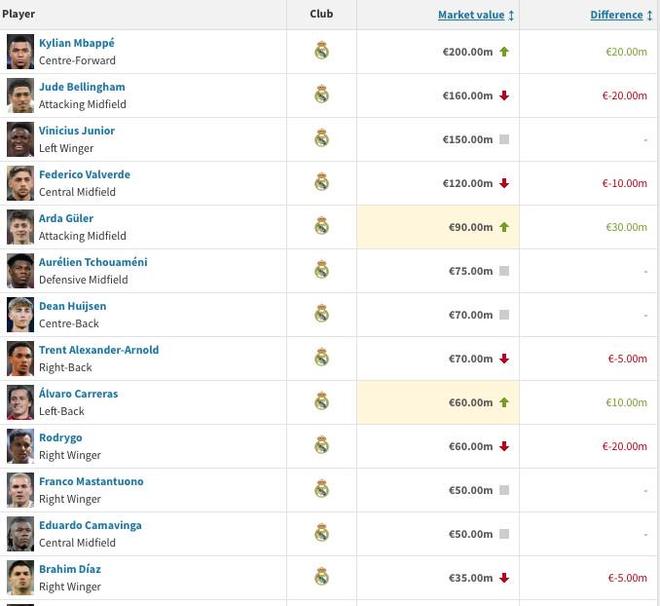 北京时间12月12日,德国人更新了西甲球员的转会市场价值。皇马球员姆巴佩的身价比上赛季增加了2000万欧元,目前身价2亿欧元。贝灵汉姆的身价下跌了2000万欧元,至1.6亿欧元。德国转皇马球员最新身价 1. 姆巴佩 2 亿欧元 2000 万欧元 ↑ 2. 贝灵厄姆 1.6 亿欧元 2000 万欧元 ↓ 3. 维尼修斯 1.5 亿欧元 4. 巴尔韦德 1.2 亿欧元 1000 万欧元 ↓ 5. 古勒 9000 万欧元 3000 万欧元 ↑ 6. 查门7500万欧元 7. 赫伊森 7000万欧元 8. 阿诺德 7000万欧元 500万欧元↓ 9. 卡雷拉斯 6000万欧元 1000万欧元 ↑ 10. ↓ 17. 库尔图瓦 1800万欧元 200万欧元 ↓ 18. 卢宁 1500万欧元 300万欧元 ↓ 19. 弗兰·加西亚 1500万欧元 300万欧元欧元 ↓ 20. 贡萨洛·加西亚 1500 万欧元 23. 吕迪格 1200 万欧元 300 万欧元 ↓ 22. 塞瓦略斯 800 万欧元 23. 门迪800万欧元 200万欧元 ↓ 阿拉巴 400万欧元